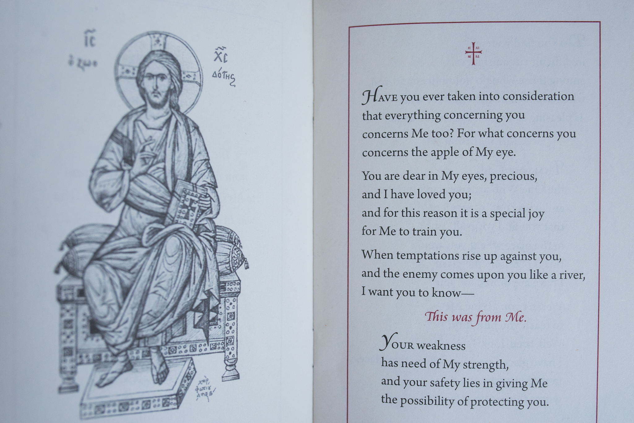 On the prayer shelf in our bedroom, I spied a booklet I hadn’t opened in a while. It was a sweet gift from a precious friend titled “This was from Me.” Its text was taken from a letter written by St. Seraphim to his spiritual child – a bishop who was in a Soviet prison camp at the time. The purpose of the letter was to console and offer counsel as if from God to man’s soul.